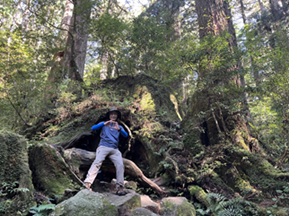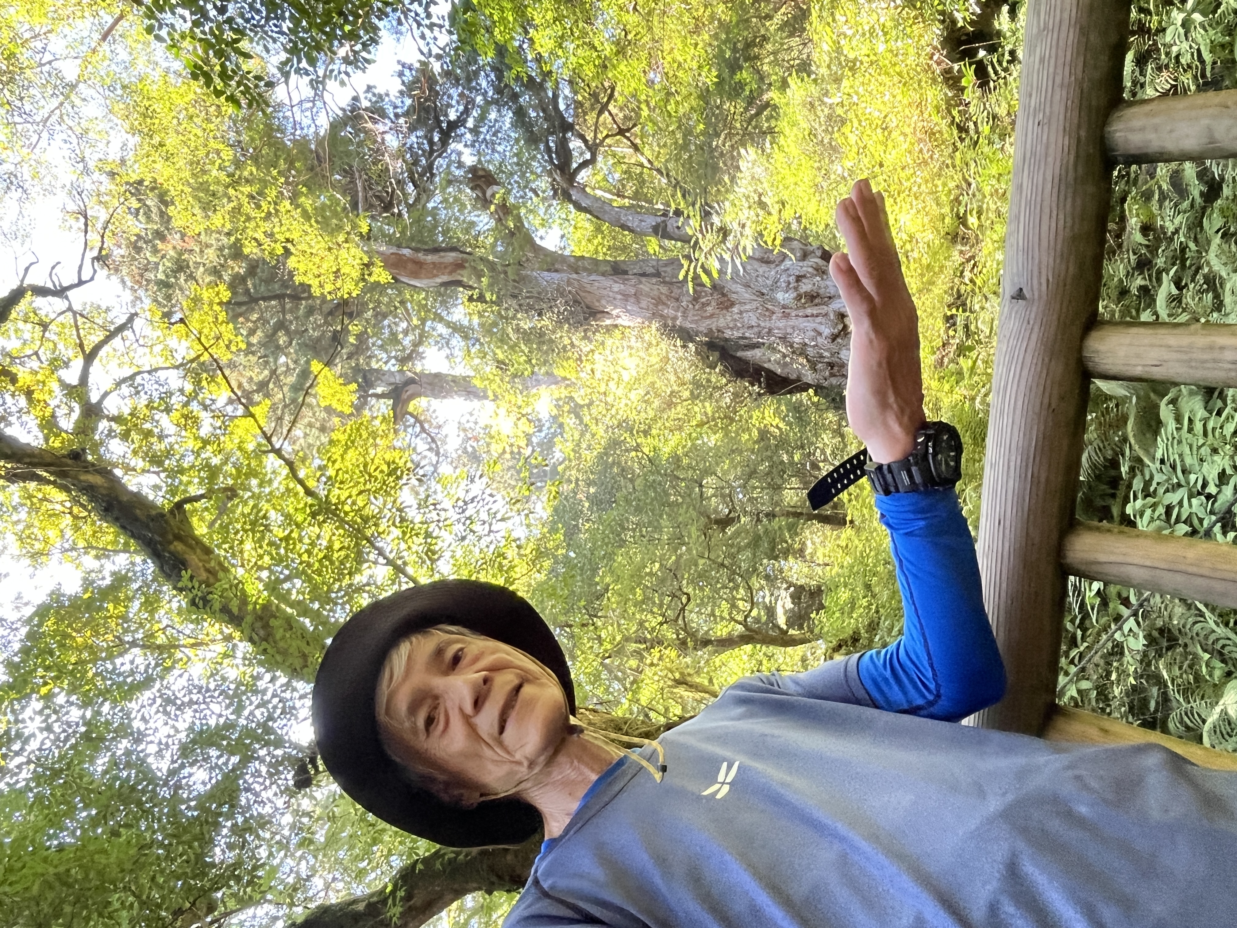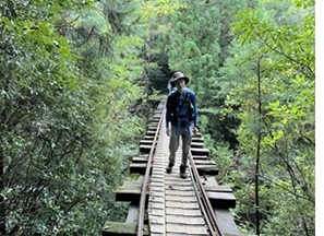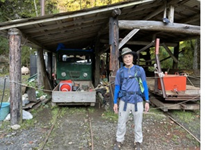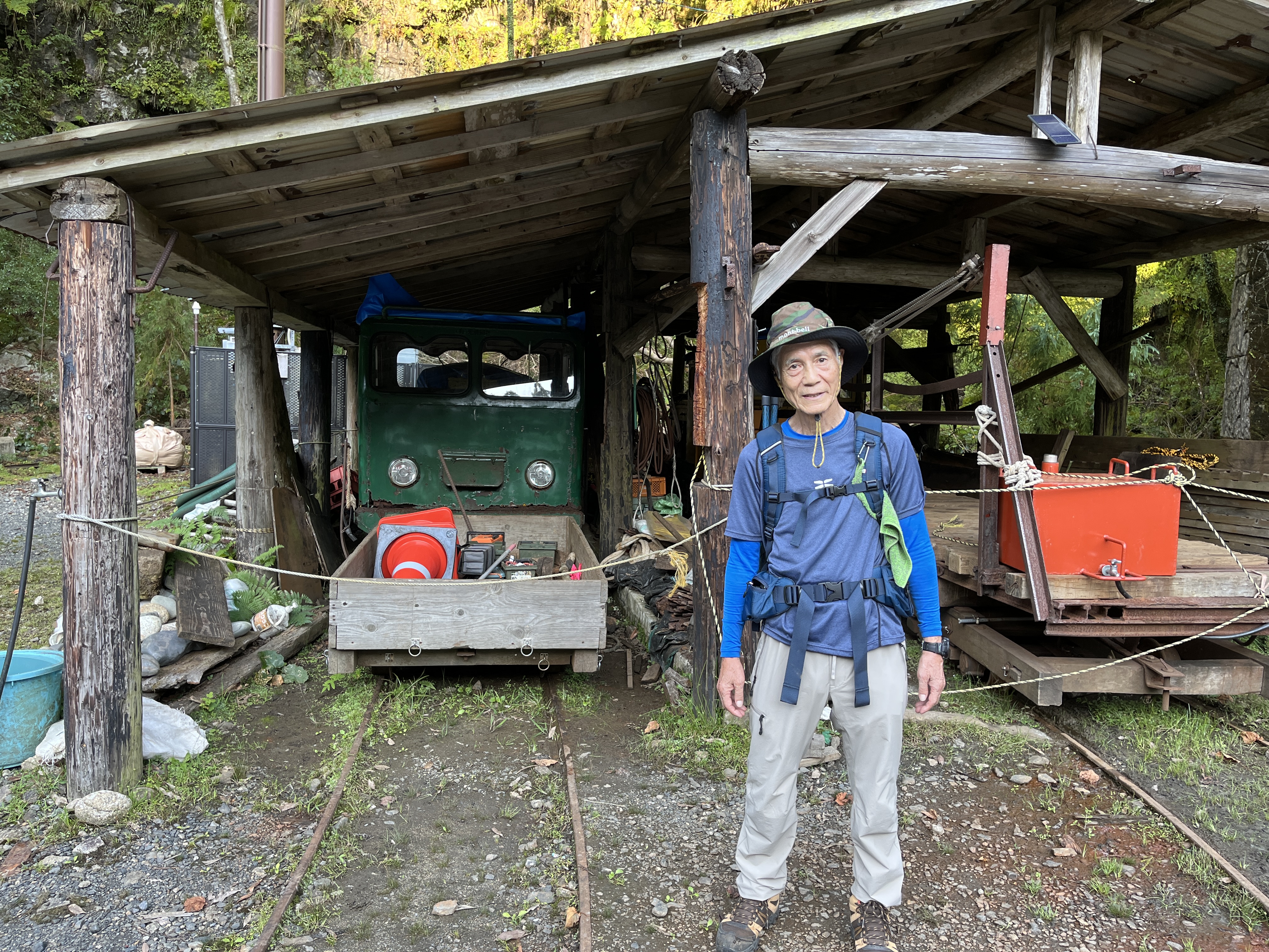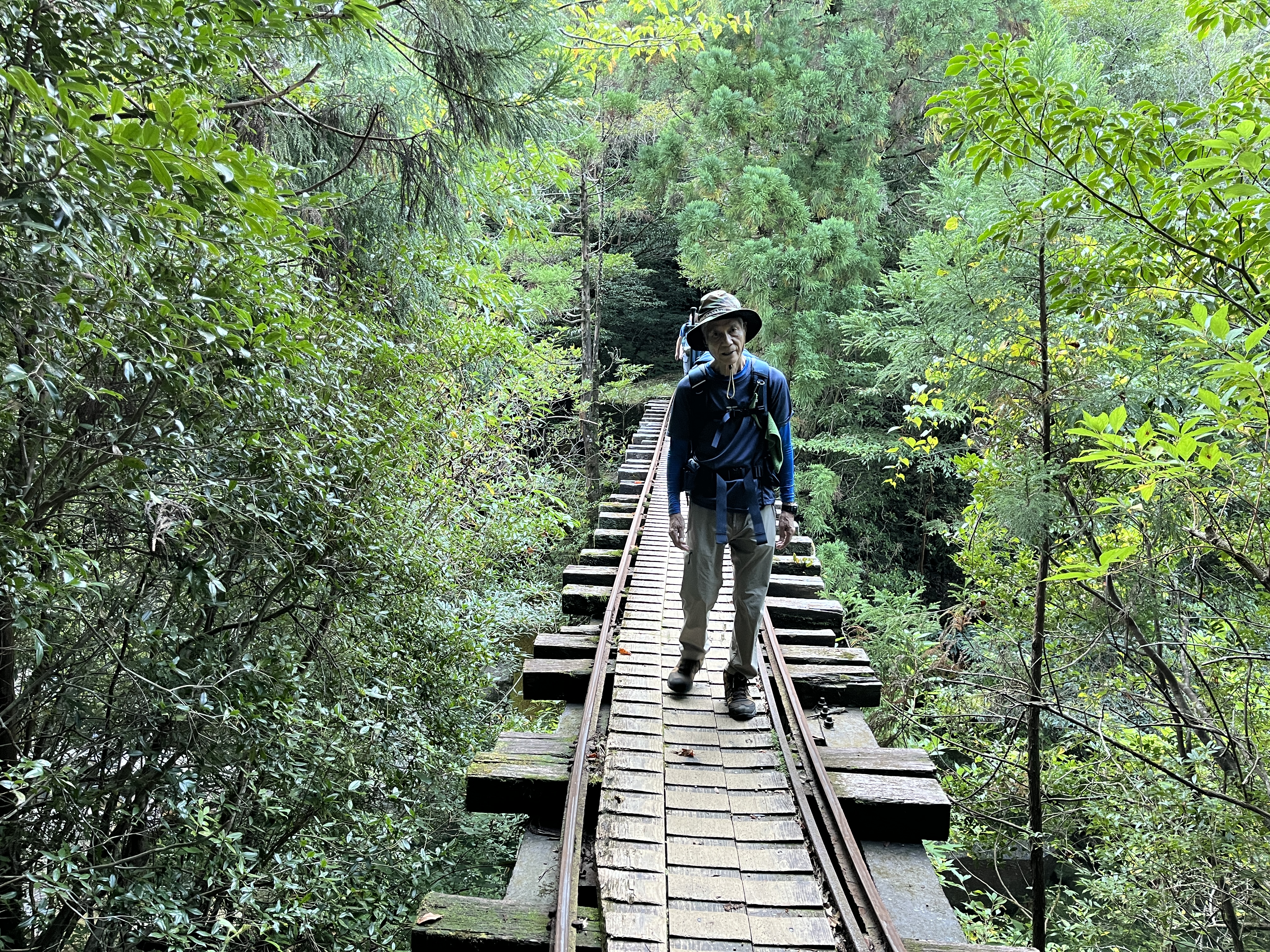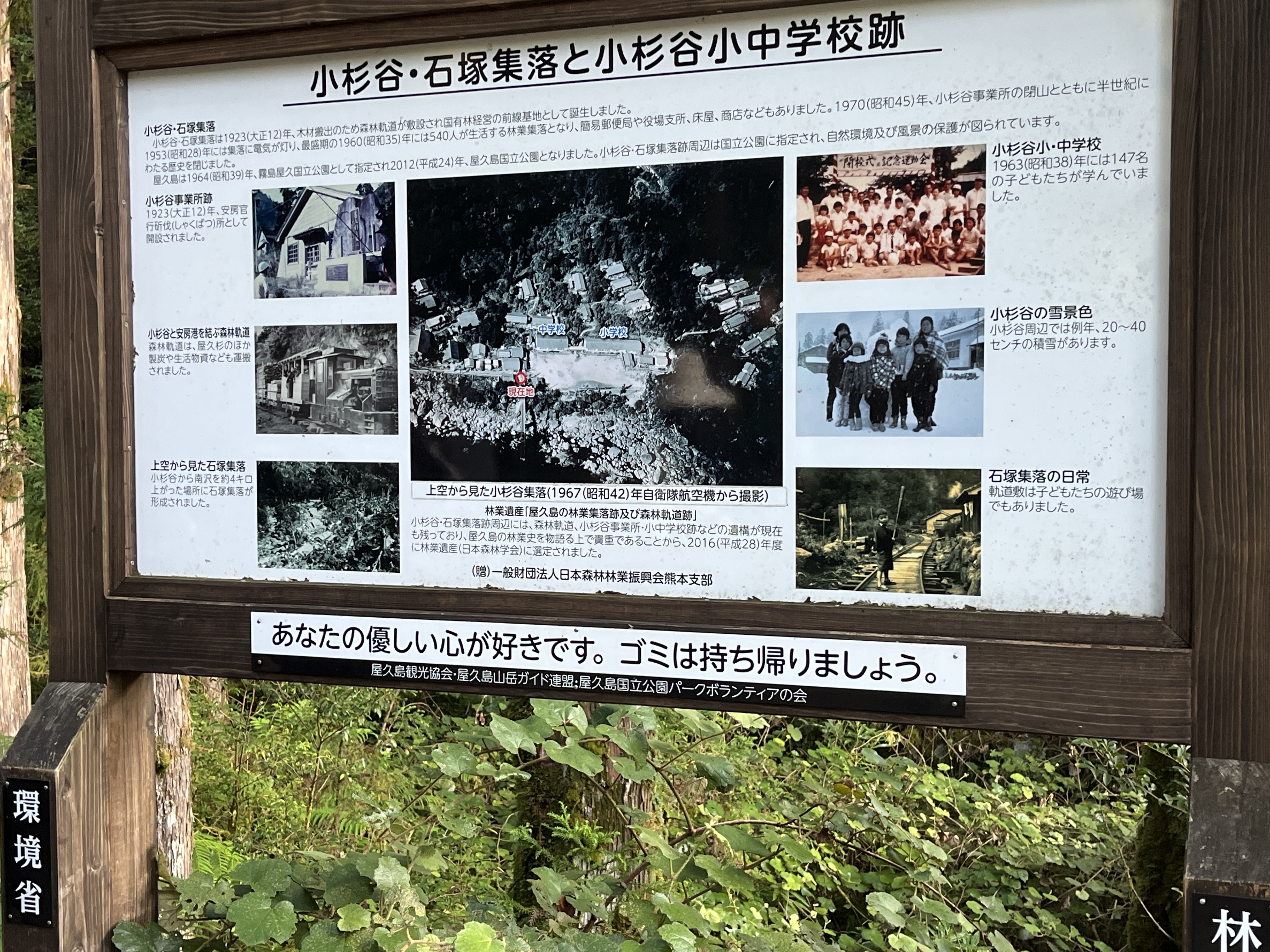 トロッコ道を通って、小杉谷・石塚集落と小杉谷小中学校跡に到着、トイレに行き、少し休憩してから、出発、途中、翁杉(倒木)の前と、ウィルソン株の前で写真を撮ってもらいました。